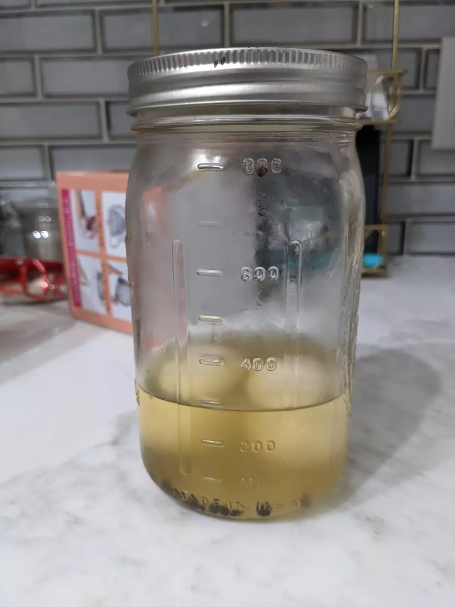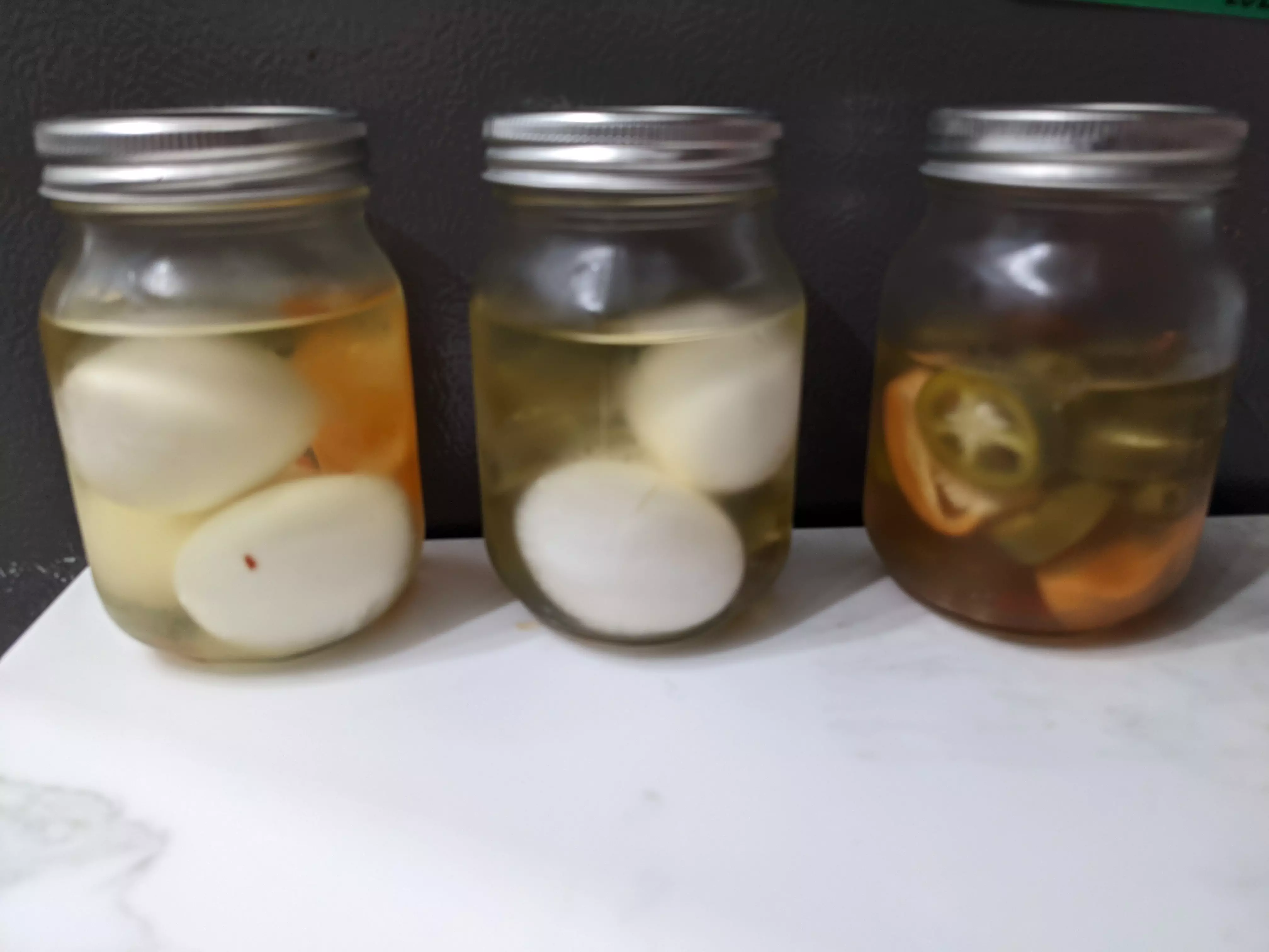 Oh, but first the eggs. I waited until the water was actually boiling this time, and did every other step the same. I don’t know if I just got lucky with these eggs, but I batted 1.000 on peeling them this time. 12 for 12. I set six aside for pickling, and left six alone for my girlfriend 👩 who prefers non-pickled eggs somehow. I got two of my mini mason jars and put three eggs in each.